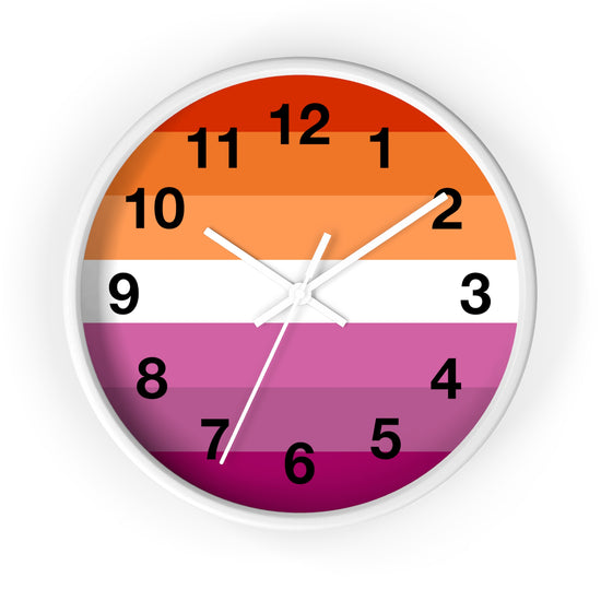 Celebrate your identity every hour of the day with this bold Lesbian Pride wall clock. Featuring the vibrant stripes of the Lesbian Pride flag, it’s more than just a way to track time—it’s a meaningful statement piece for your home, office, or creative space. The sleek black frame and easy-to-read numbers keep it practical, while the silent sweep hands ensure a calm, tick-free environment.
