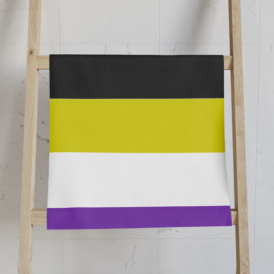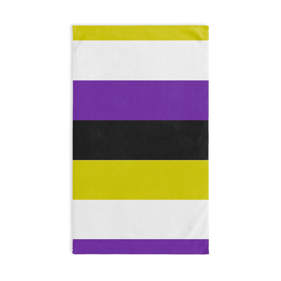 Bring bold energy and pride into your home with this Non-Binary Pride hand towel. Featuring the striking black, yellow, white, and purple stripes of the Non-Binary flag, this towel celebrates individuality and self-expression in every detail. Soft, lightweight, and super absorbent, it’s as functional as it is meaningful—perfect for drying hands, adding color to your kitchen or bathroom, or gifting to someone who embraces their authentic self.
