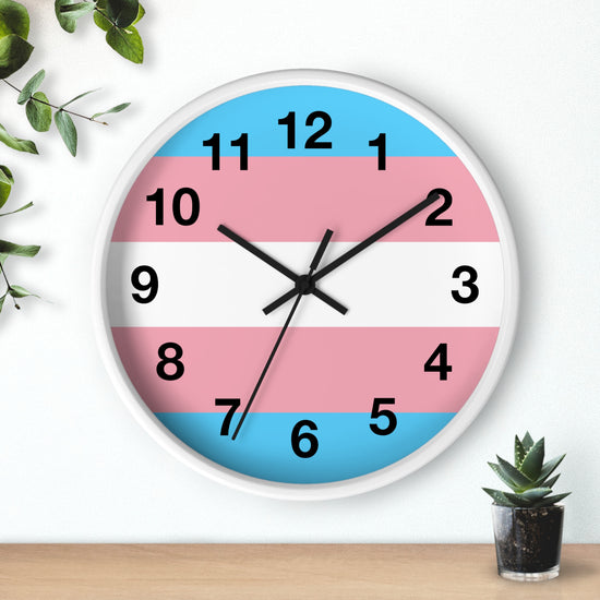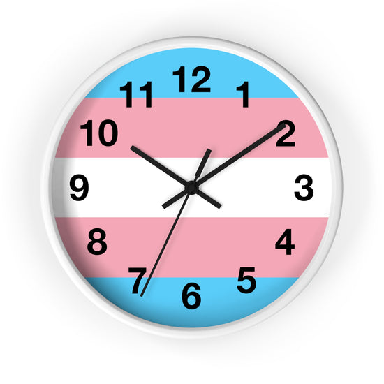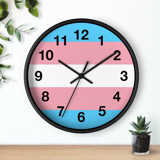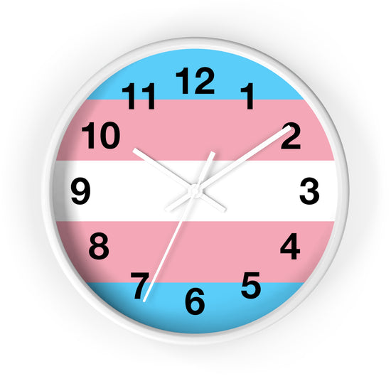 Celebrate your identity every hour of the day with this bold Trans Pride wall clock. Featuring the vibrant stripes of the Trans Pride flag, it’s more than just a way to track time—it’s a meaningful statement piece for your home, office, or creative space. The sleek black frame and easy-to-read numbers keep it practical, while the silent sweep hands ensure a calm, tick-free environment.
